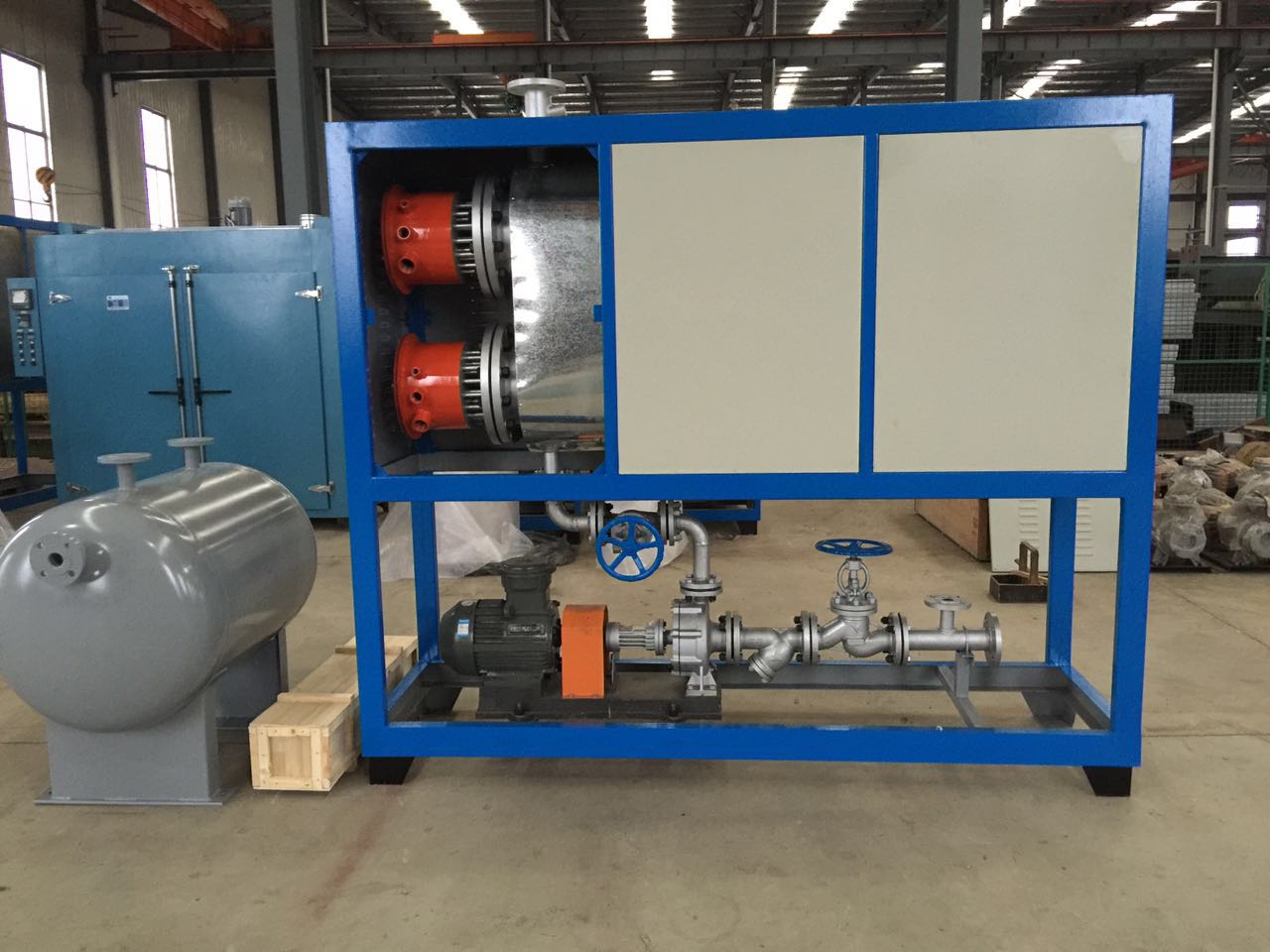 導熱油爐排氣流程: 1、導熱油通過膨脹槽注油口處加注,并通過膨脹口管道流入設備及油爐本體內(nèi),此時注油時一定要打開系統(tǒng)中所有的閥門(放油閥除外),讓導熱油流入筒體及需加熱設備內(nèi)。 2、當液面顯示約為膨脹槽高度1/2時,停止注油。 3、首 行常溫排氣:接通電源,打開導熱油加熱器的進出口閥門及排氣閥(膨脹管道閥門需一直開著以及時補充油量),按動油泵啟動按鈕,油泵運行,油泵應按箭頭指示方向正常運行,壓力表壓力顯示在規(guī)定范圍內(nèi),視聽油泵運行情況,如有異常現(xiàn)象應立即停機檢查,將故障排除后再重新起動油泵,進行常溫下排氣,直至壓力表指示穩(wěn)定。進行常溫排氣時,要注意觀察膨脹槽內(nèi)的液位,當?shù)陀谝?guī)定的液位高度時要及時進行補充。 4、升溫脫水:在確認常溫下運行正常后,即可進行升溫脫水排氣(操作前詳閱導熱油使用說明書及溫控儀使用說明書),升溫脫水排氣可按如下步驟進行: 步:升溫至100-120℃保溫 開始升溫時,應該控制升溫速度在50℃/h以內(nèi),并且監(jiān)視壓力表顯示是否正常,如發(fā)現(xiàn)無壓力或壓力不穩(wěn),說明系統(tǒng)內(nèi)仍有殘留氣體,此時要求按3要求重復進行常溫排氣操作,待系統(tǒng)壓力穩(wěn)定后方可繼續(xù),升溫至120℃后進行長時間保溫,保溫時間的長短與系統(tǒng)總容量及導熱油的質(zhì)量有關。  第二步:升溫至150-180℃保溫。  排除油中輕組分、揮發(fā)物及殘余水分,請參照KRD系列導熱油加熱器系統(tǒng)脫水排氣曲線圖操作 第三步:脫水排氣完成后要關閉排氣閥(其它閥門無需關閉),投入正常升溫運行。 5、 升溫脫水排氣過程有關事項。 升溫過程中管路可能會發(fā)出碰擊的響聲,說明系統(tǒng)內(nèi)有大量氣體或管道不暢,此時要降低升溫速度,待氣體排除便可消除聲響;如系管道不暢所至應予以排除。 脫水排氣過程可能會有大量氣體涌入膨脹槽,造成槽內(nèi)導熱油外溢,操作前要在溢油管下安置好溢油容器。 進行脫水排氣時,現(xiàn)場必須有人員看守,發(fā)現(xiàn)異常及時處理。   對于所提的油泵無油或少許油流出的問題,解決方案如下: 1、 關閉出油口閥門,啟動油泵,觀察壓力表顯示情況,若無壓力,則說明回油口無油補充油泵,使得油泵空轉(zhuǎn),無后續(xù)油及時補充,則請貴司檢查一下回油口的供油情況,此時請確保膨脹槽里有油并膨脹管道閥門打開和需熱設備有油并出油口閥門在打開狀態(tài)。 2、 如果以上要求都執(zhí)行到位,壓力表還無壓力,請檢查油爐上的油泵、截止閥及過濾器是否堵塞。 3、 若壓力表顯示壓力值,而油泵、截止閥及過濾器并無堵塞,那油爐的出油口一定會按油泵所提供的流量進行流出。